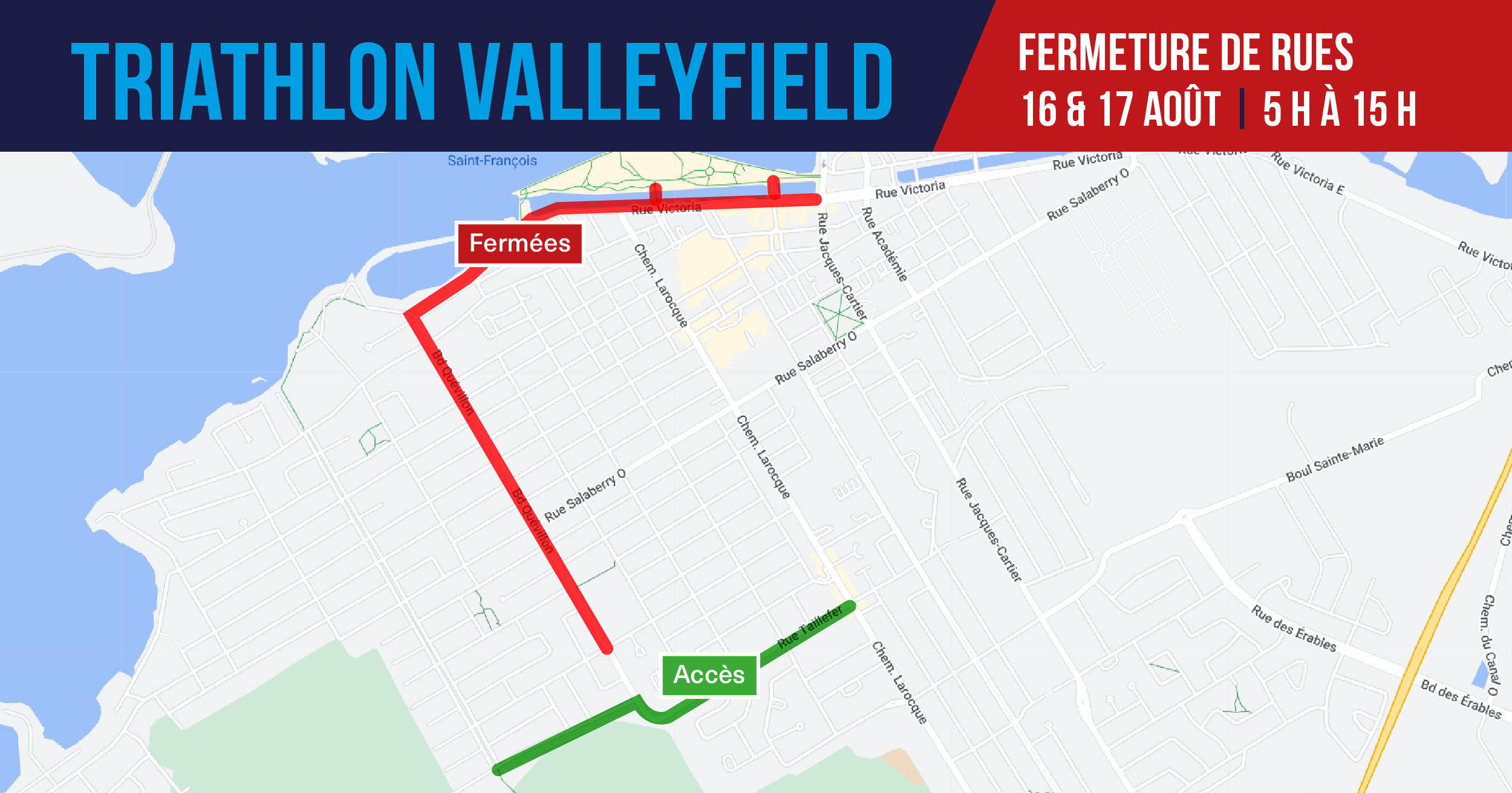 Les 16 et 17 août prochain, la Ville de Salaberry-de-Valleyfield accueille la 22e édition du Triathlon Valleyfield, un événement sportif des plus appréciés. Quelque 1 500 athlètes y participent, sous les encouragements de nombreux visiteurs, dont 5 athlètes en para-triathlon cette année. Différentes entraves à la circulation routière sont toutefois à prévoir.